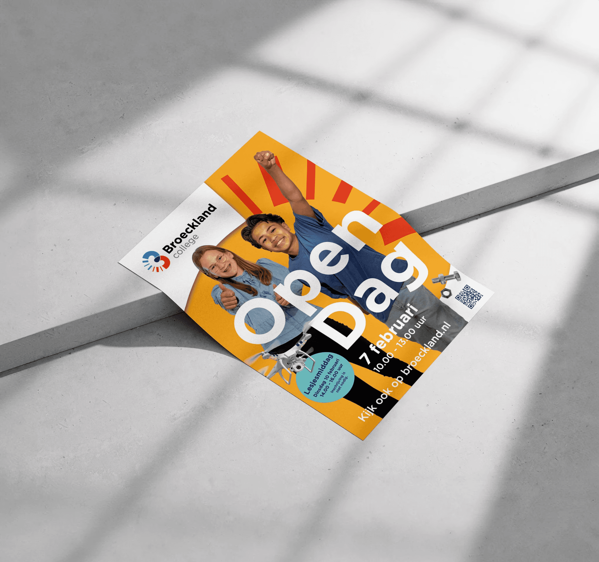 Tijdens mijn stage heb ik deze poster ontworpen voor de open dag van het Broeckland College. De uitdaging was om een ontwerp te maken dat echt opvalt, maar tegelijkertijd naadloos aansluit bij de bestaande huisstijl van de school.Door verschillende ideeën en kleurcombinaties tegen elkaar af te wegen, ben ik tot een resultaat gekomen dat perfect voldoet aan de wensen van de klant. Dankzij de nauwe samenwerking tussen mijn stagebedrijf en de school verliep het feedbackproces soepel, wat hielp om de puntjes op de i te zetten. De gebruikte fotografie in het ontwerp is verzorgd door mijn stagebedrijf.